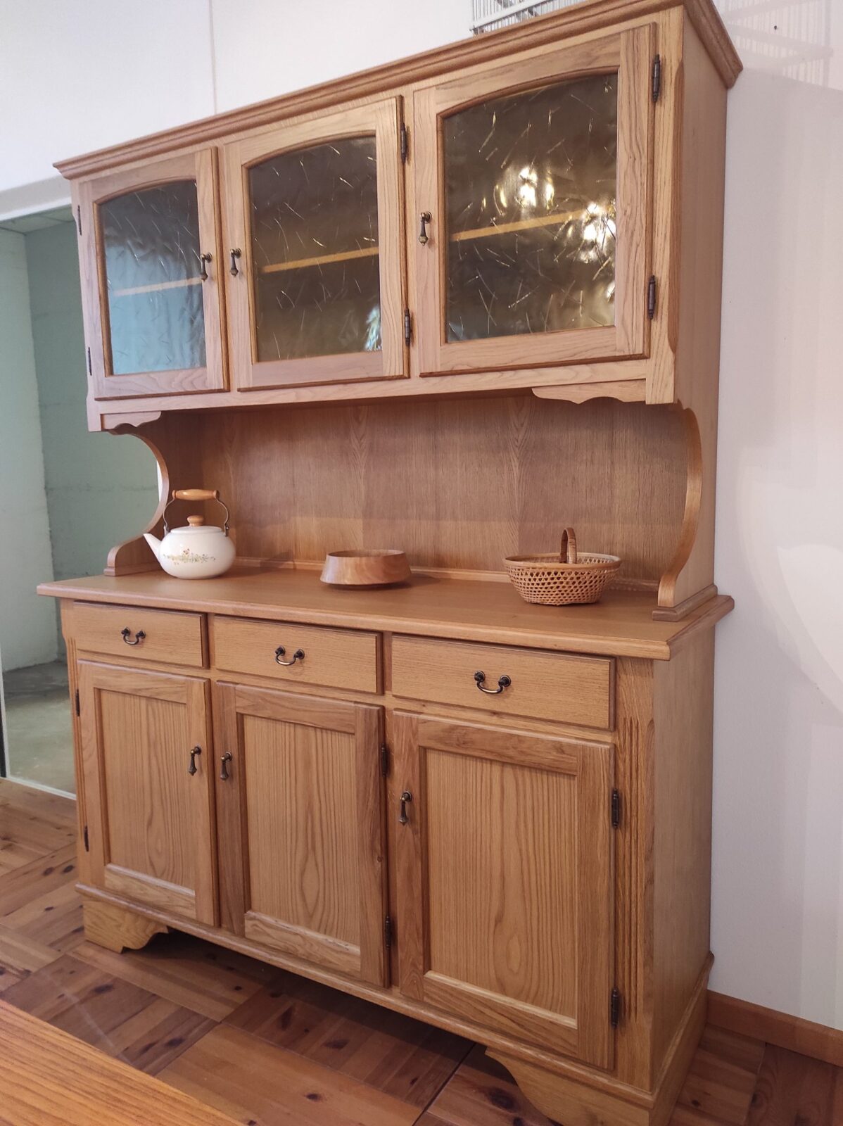 Credenza in rovere naturale nostra produzione composta da 3 ante e 3 cassetti sotto e 3 ante vetro sopra. Dimensioni cm 148 x 48/37 profondità x 187 h