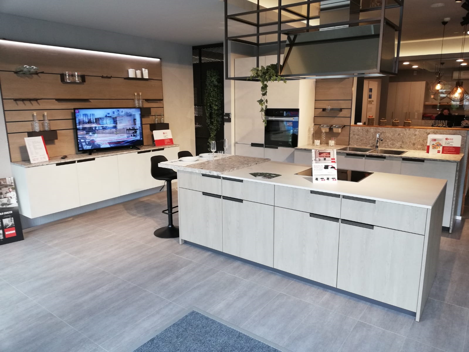 La cucina MIA include rilievo misure, piano di lavoro in gres, lavello inox filotop, IVA e montaggio, con la possibilità di scegliere tra una vasta selezione di elettrodomestici per completare il progetto in base alle proprie esigenze.