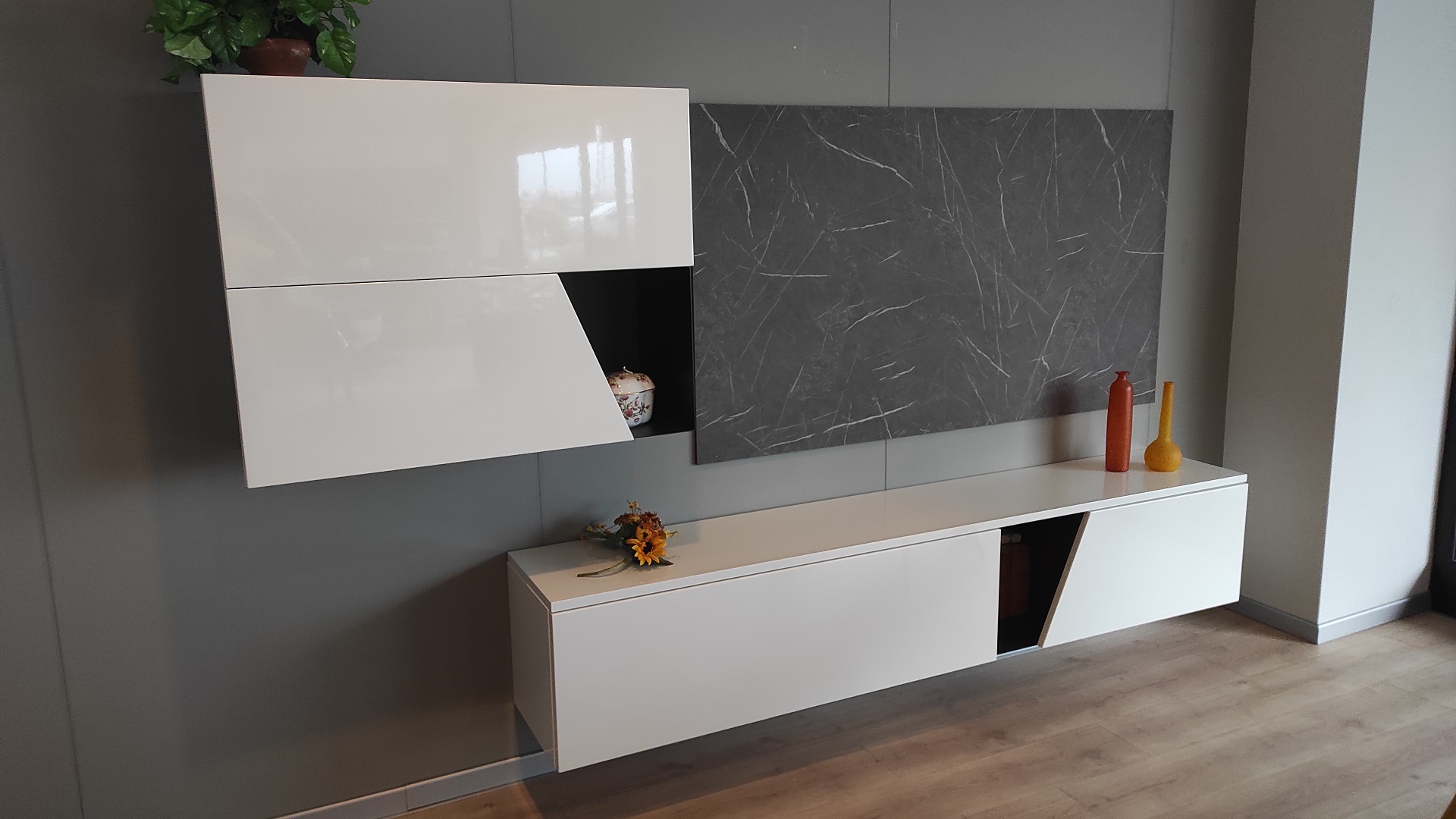 Il soggiorno Scavolini modello Liberamente rappresenta un perfetto equilibrio tra eleganza contemporanea e funzionalità. La finitura laccata bianco lucido dona luminosità e leggerezza all’ambiente, creando un raffinato contrasto con i dettagli in metallo color antracite e con il pannello porta TV in Pietra Grey. La composizione, sospesa a parete, è studiata per offrire linee pulite e un effetto visivo di grande modernità. Le basi da 210 cm di larghezza con profondità 36 cm e altezza 39 cm garantiscono ampio spazio contenitivo, mentre i pensili da 90 x 36 x 72 cm completano l’insieme con un design essenziale e coerente.