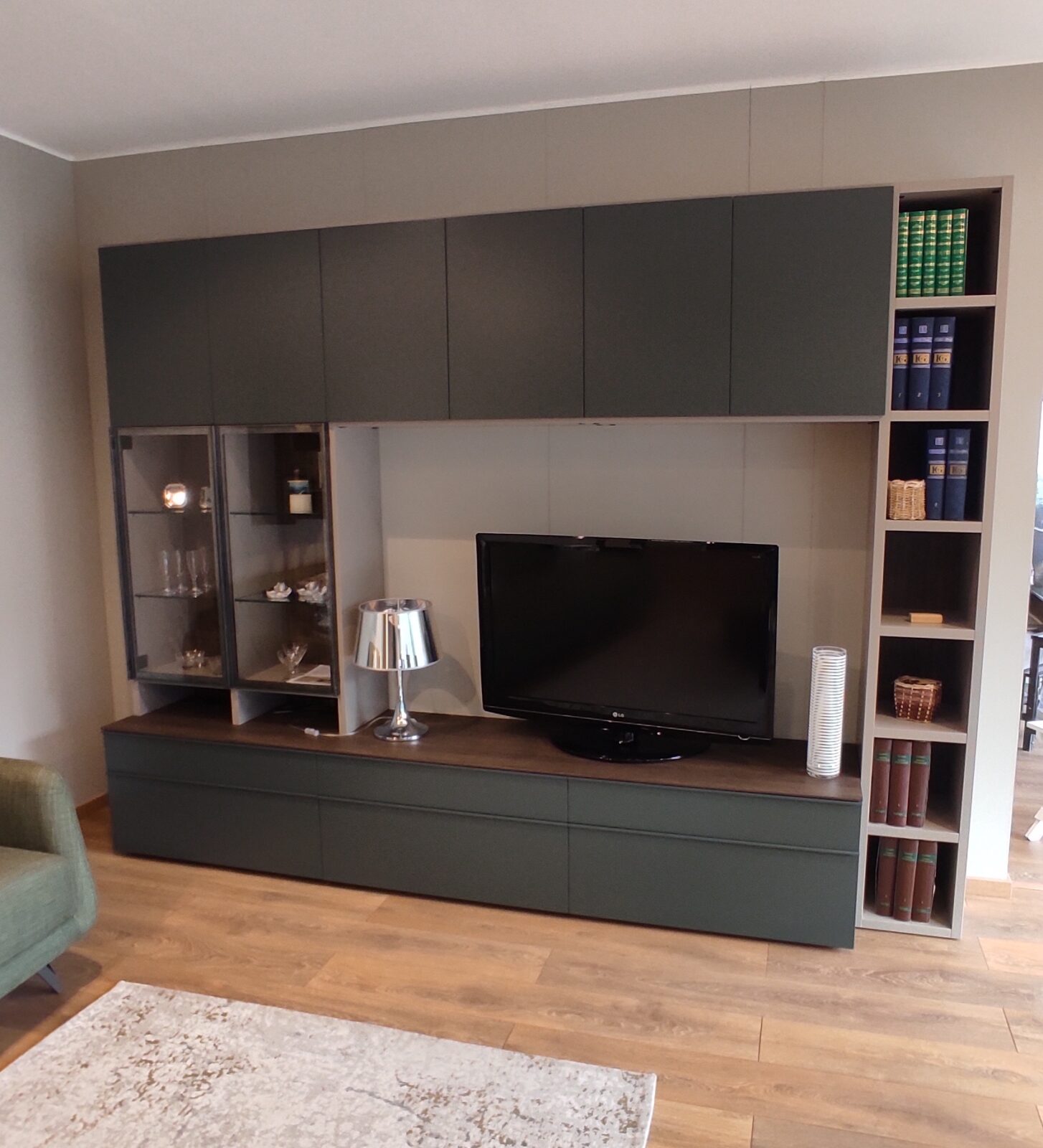 Parete Living molto capiente e funzionale con 3 basi da cm 90 x 52 di profondità x 52 h con 1 cassetto e 1 cesto in finitura Laccato opaco Ginepro 355 e una comoda maniglia a profilo laccata dello stesso colore.
