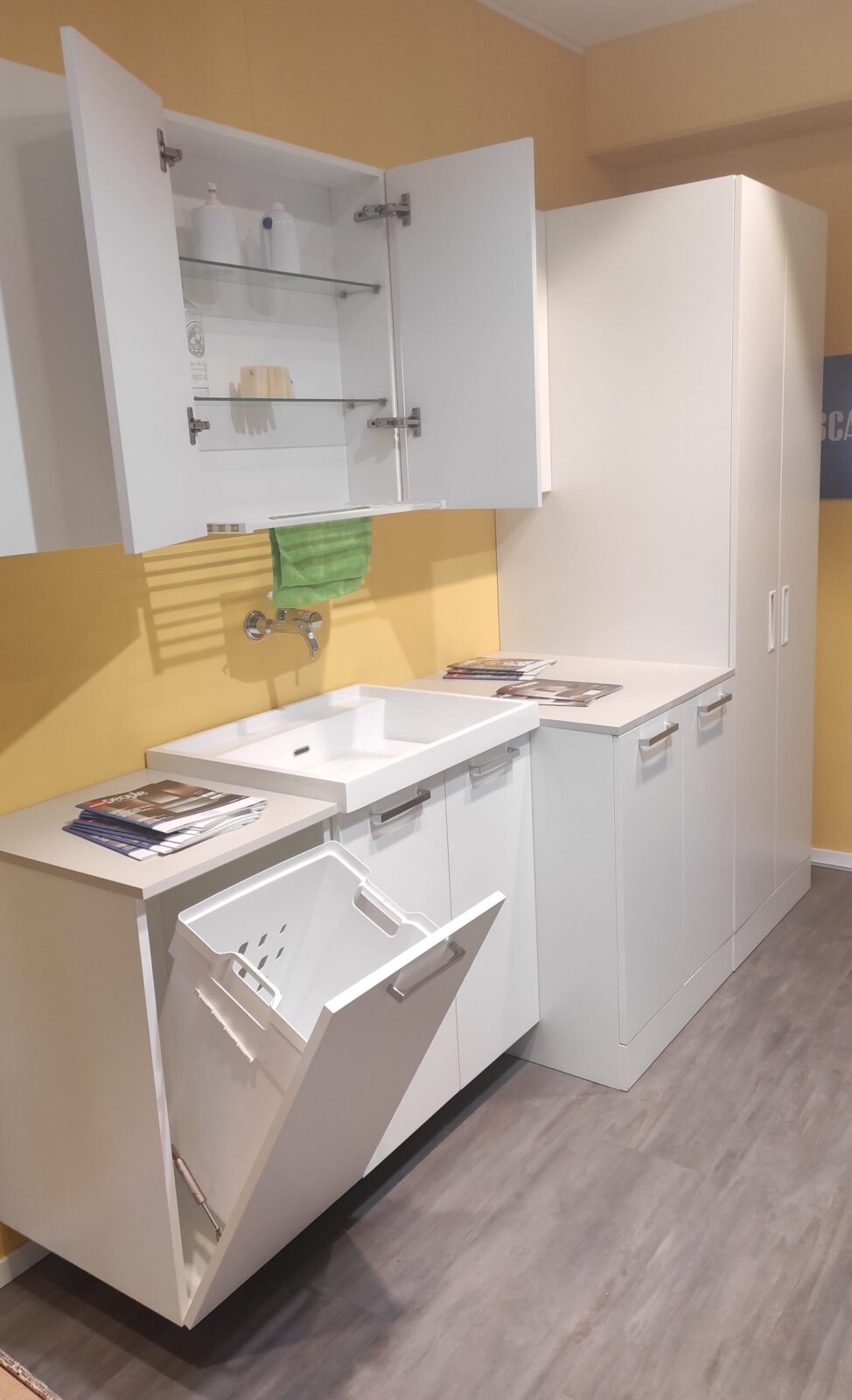 La composizione, delle dimensioni di 255 cm di larghezza, 52/75 cm di profondità e 212 cm di altezza, è strutturata in modo da offrire la massima efficienza: include una base porta biancheria, una base lavabo che si trasforma in comoda lavarina con asse integrato, un pensile pensato per stendere piccoli capi, una base per lavatrice e una colonna multifunzione con ripiani e vano dedicato a scope e utensili domestici.