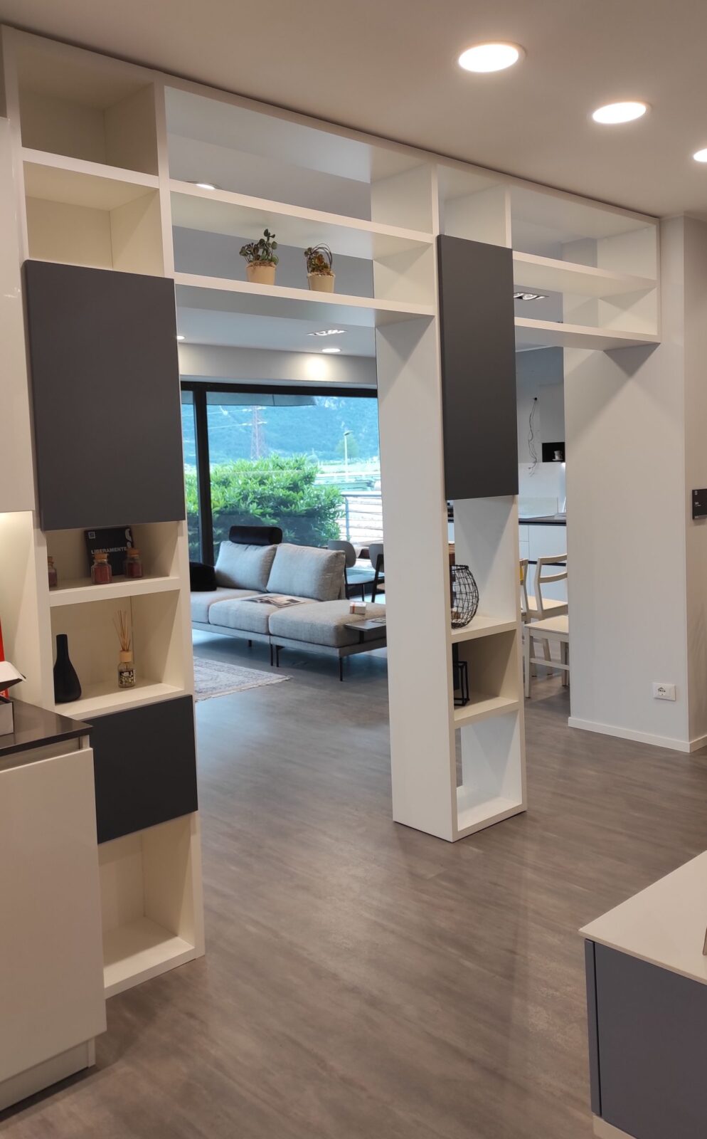 Il decorativo bianco puro conferisce luminosità e armonia all’ambiente, mentre le ante in Fenix grigio Bromo introducono un tono sofisticato e contemporaneo, creando un raffinato contrasto cromatico. La struttura, solida ma visivamente leggera, consente di separare le zone della casa senza appesantire gli spazi, offrendo allo stesso tempo praticità e grande impatto estetico.